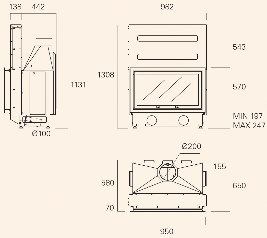 Module with sliding/swinging-down door. Interior of the hearth coated with firebricks and vermiculite baffle plate. External air intake. Primary and secondary register. High-resistance fire grill and ash pan. 4 cm frame included.
