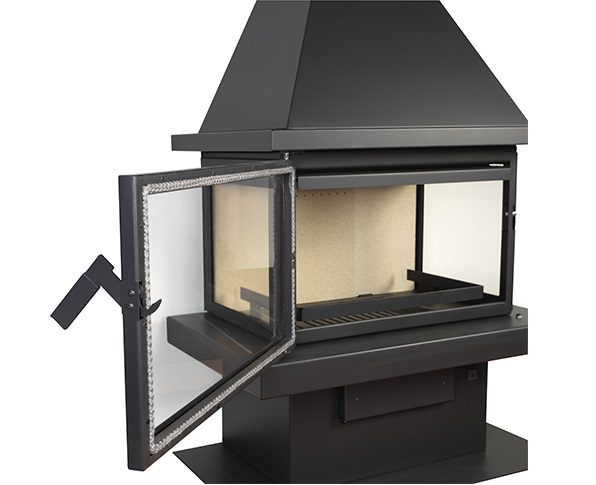 Front facing fireplace with traditional hood, vermiculite panels, external air intake, security or air, tertiary.  Manufactured in steel plate, it includes an ash pan, primary and secondary register, vitroceramic glass 750°C and heat resistant paint.