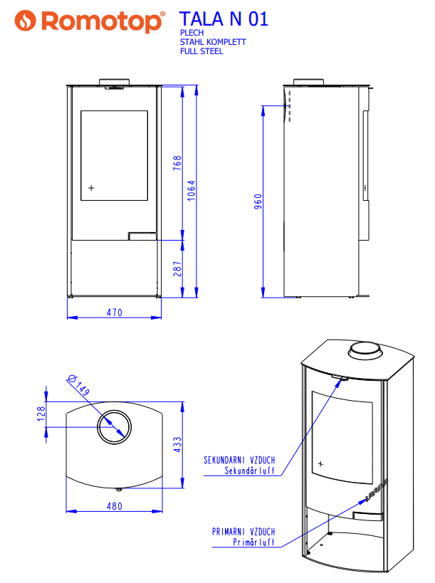The defining feature of the Tala N is the large door for an unobstructed view of the fire. The main material used for the body is sheet metal, which also determines the overall impression of the stove.